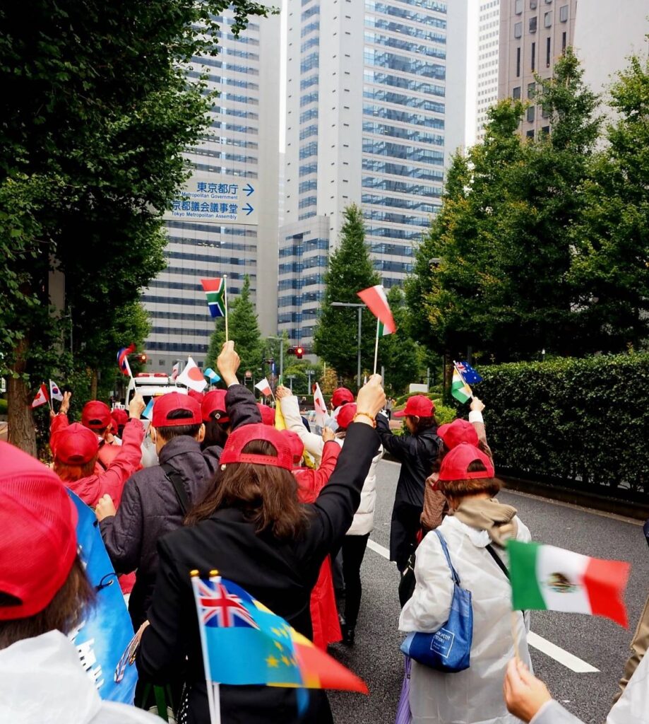万国旗を振りながら130人の笑顔が新宿の街を包みました。